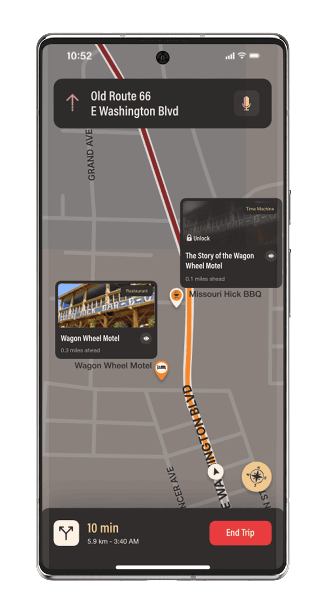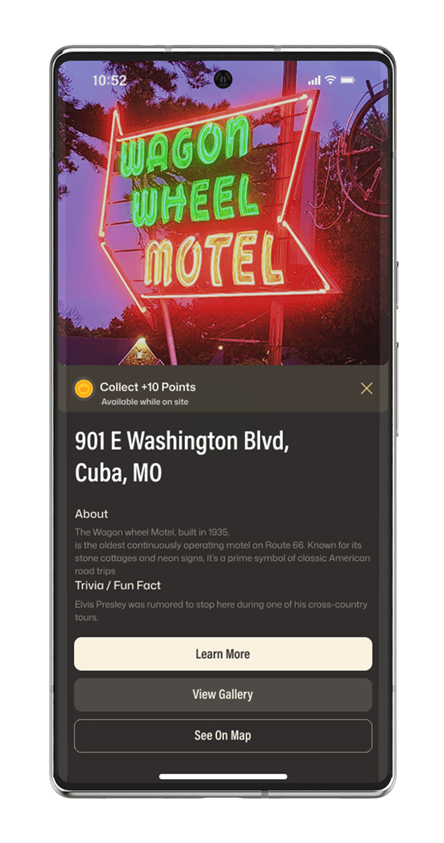 Unlock Route 66 history through interactive hunts. Discover stories at real stops, earn rewards, and watch the past come alive on your journey.